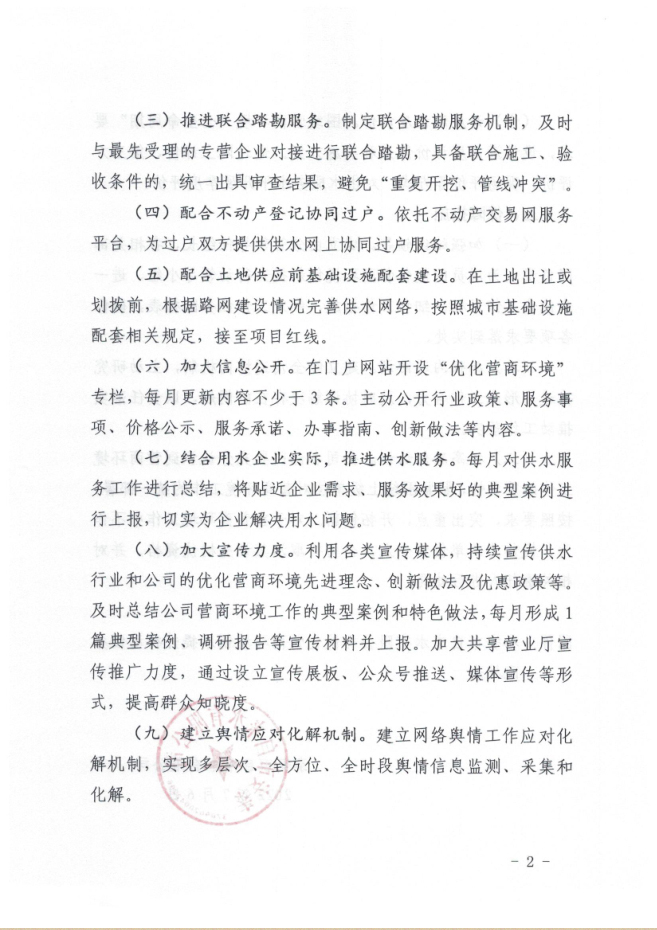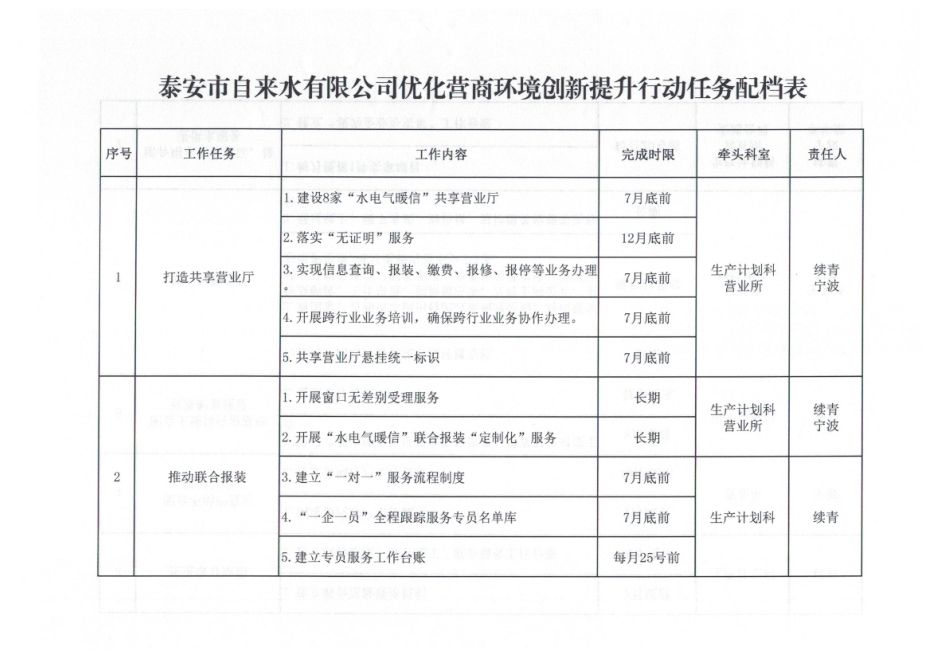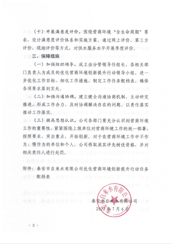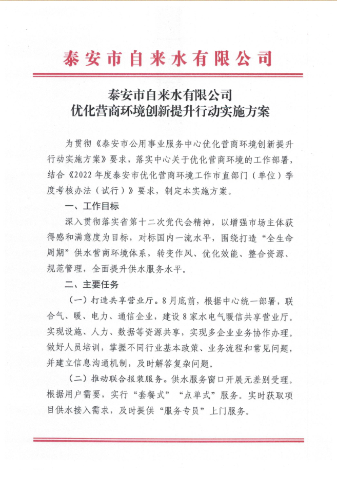 您当前位置》政策法规》泰安市自来水有限公司优化营商环境创新提升行动实施方案