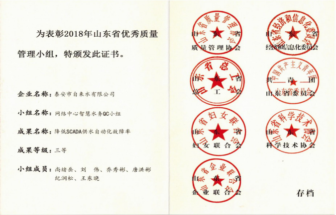 该课题成果旨在探讨供水自动化故障率较高的要因及对策实施、目标实现、巩固措施。严格的管理,团结的团队,必然会带来可喜的成绩。该课题成果获得泰安市质量管理协会二等奖,并被推荐山东省质量管理协会,获得省质协三等奖。